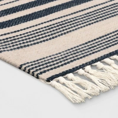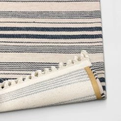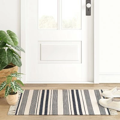 Give any space in your home a distinctive look with the Pet Tapestry With Fringes Woven Indoor/Outdoor Rug from Thresholdβ’. Featuring navy woven stripes on an ivory background, this rectangular accent rug blends seamlessly with just about any existing decor, while the fringed ends lend a playful finishing touch. The woven fabric provides soft comfort underfoot, while helping add warmth to hard flooring like tile. This accent rug is ideal for placing in front of a kitchen sink, inside or outside your front door, or in front of your hallway closet, and it’s machine-washable for easy care and cleaning.