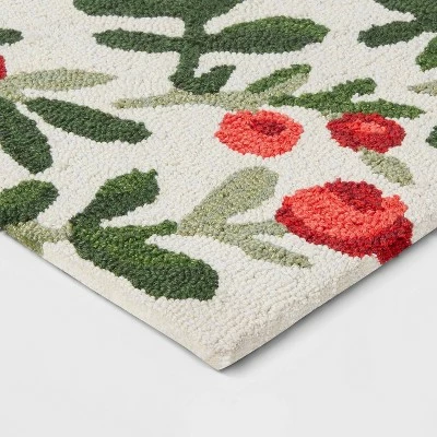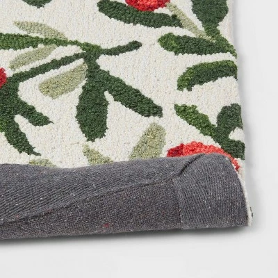 Add comfort underfoot and a festive pop of style to your kitchen space with this Goodweave certified Cotton Holly Berry Kitchen Rug from Threshold™. This rectangular area rug comes in a tufted and hooked construction for a comfy, cozy feel underfoot, complete with a cotton backing. Showcasing an allover holly berry pattern in a bright hue for a festive look, this handmade area rug adds subtle holiday cheer to your kitchen while providing a great spot to stand as you wash dishes or complete other kitchen chores.