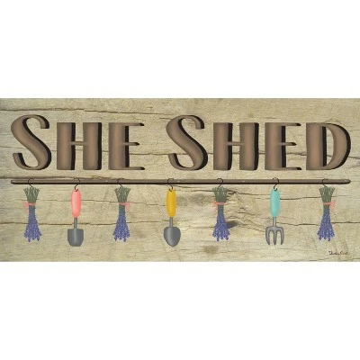 - Against a wood textured background, this design reads “She Shed” above garden utensils hanging from hooks.
