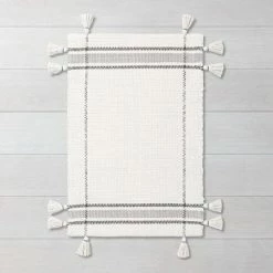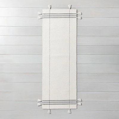 Add some depth and dimension to your home with the Simple Border Stripe with Corner Tassel Rug from Hearth & Hand™ with Magnolia. Made from a soft wool blend, this hand-woven rug has a richly textured look, and it’s finished with border stripes in gray and corner tassels for chic appeal. Easy to blend into any decor scheme, this flat-pile rectangular rug will fit under most doors, making it a versatile option for anywhere in the home — from the entryway to the living room and more.