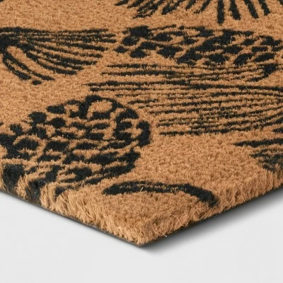 Enhance your doorway or patio area with this Pine Coir Inline Doormat from Threshold™. This printed natural fiber doormat features a rectangular shape and a medium-pile construction, combining functionality and classic style for a versatile addition that easily complements a variety of decor schemes. Made from 100% coir, this tufted doormat provides lasting use while helping clear dirt and debris from shoes to keep your space clean, and the PVC backing helps prevent it from slipping or sliding. Featuring an allover print of pinecones and branches in black against a tan background, this coir doormat adds a warm and friendly vibe to your surroundings.