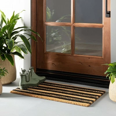 Protect your floors and add a classically inviting feel to your entryway with the Painted Stripes Coir Doormat from Hearth & Handβ’ with Magnolia. Made of 100% coir with medium pile-height fibers, this rectangular doormat is naturally coarse and absorbent, making it perfect for brushing off moisture, mud and dirt from shoes. Designed for everyday use, this outdoor doormat is adorned with a screen-printed design of horizontal, irregular stripes with varying thickness in black over a brown backdrop to usher in guests with a warm welcome. Plus, the coir mat has a vinyl backing that helps to keep it in place as youβre scraping your shoes clean.