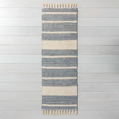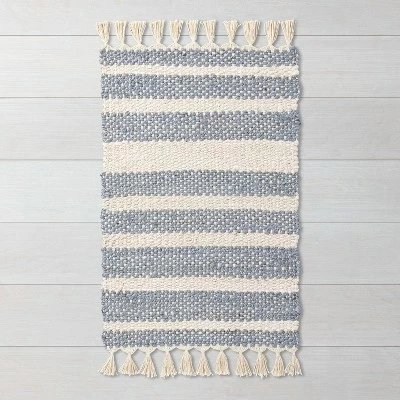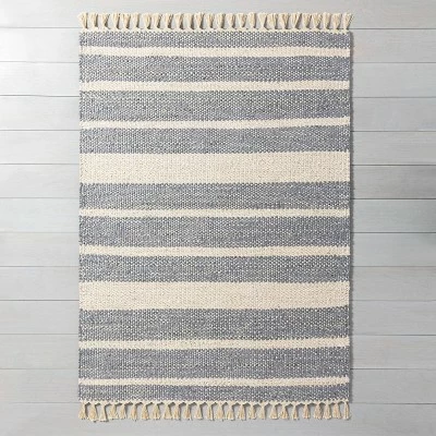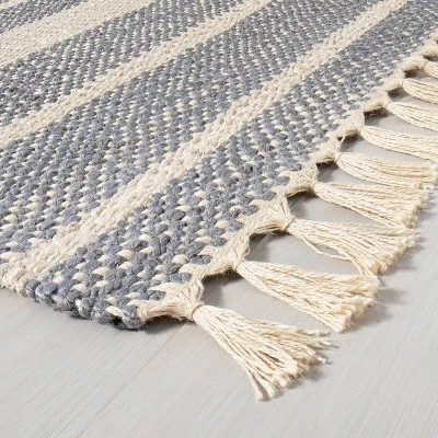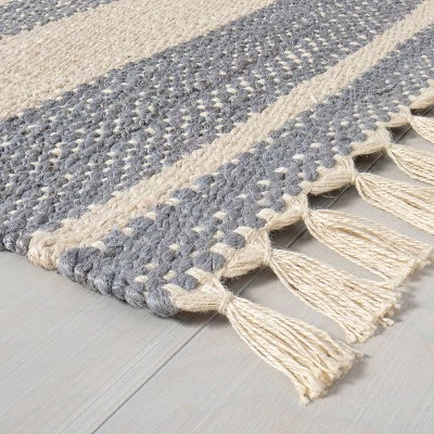Bring interesting texture to your home with the Jute Stripe with Tassel Fringe Rug from Hearth & Hand™ with Magnolia. Made from 100% jute, this hand-loomed rug showcases textured gray horizontal bands on a blush background, and it’s finished with tasseled fringe detail on the ends for a playful look. Easy to blend into any decor scheme, this flat-pile rectangular rug will fit under most doors, making it a versatile option in your home.