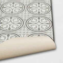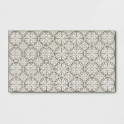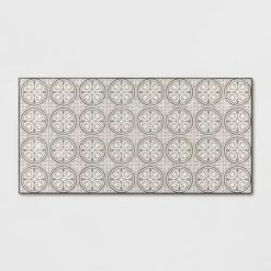 Cover your flooring in vintage style with this Medallion Tile Vinyl Accent Rug from Threshold™. Showcasing a vintage medallion tile design for a charming aesthetic, this rectangular tile rug makes a stylish floor covering, and blends well with both traditional and contemporary decor styles. With a durable backing that also helps keep the rug in place on smooth surfaces and a flat pile height for easy cleaning, this vinyl accent rug pairs functionality with style.