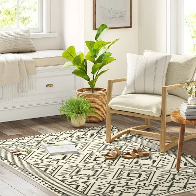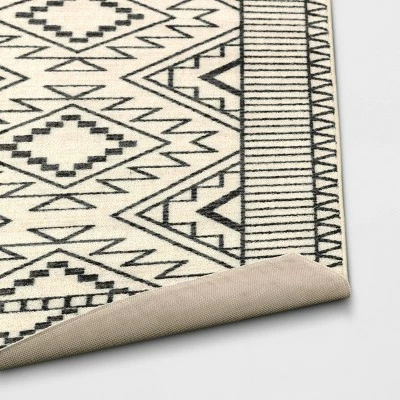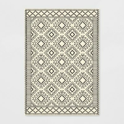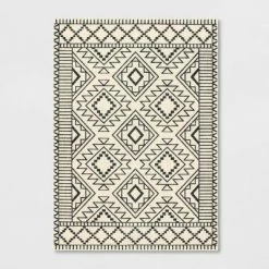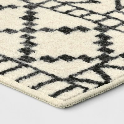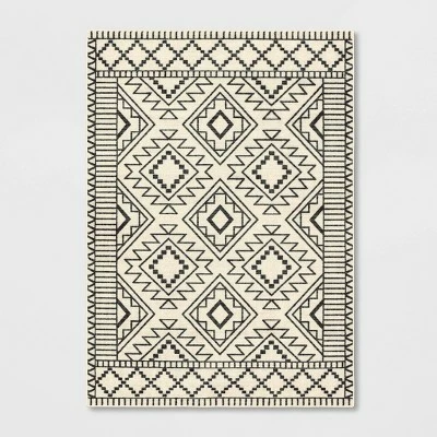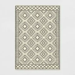 Bring monochrome fun to your floors with the New Haven Southwest Style Diamond with Border Rug from Threshold™. Made of a soft material with a latex backing for added convenience, this tufted rug will instantly change the look of any room while providing soft comfort underfoot. This rectangular area rug is designed with a soft white surface decorated with a seamless pattern of stylized diamonds in black and framed by a complementing geometric-pattern border for a chic aesthetic that perfectly integrates with your existing decor. Easy to clean, this low-pile rug is ideal for use in a variety of areas within your home, including the living room, bedroom, home office or den.