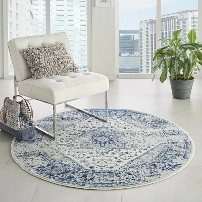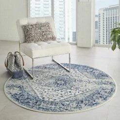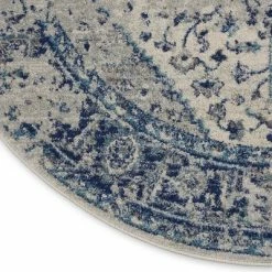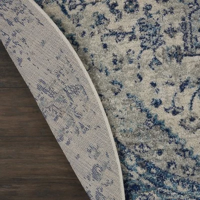 Rich navy blues offset perfectly with ivory and sky blue in this corner-and-medallion Kashan rug design from the Tranquil Collection. Traditional abrash colors lend a vintage flavor to the overall effect, for an antique feel coupled with modern easy-care fibers.