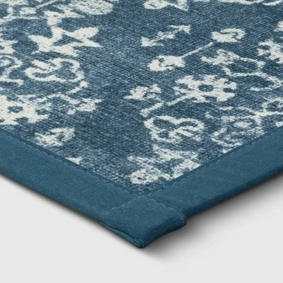 Welcome weathered elegance and timeless beauty into your home with the Vintage Print Rug from Threshold™. This rug provides an effortless way to enhance the look of your open floors while adding comfort and character to any room. This woven rug is adorned with geometrical medallion motifs made with traditional designs in white over a blue background in distressed finish for vintage charm. It’s framed by a stitched border in solid blue for a neat and sophisticated look. Easy to clean, this flat-pile rug is ideal for use in a variety of areas within your home, and it has a latex backing to help keep the rug in place.