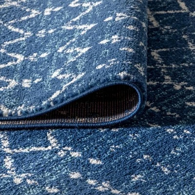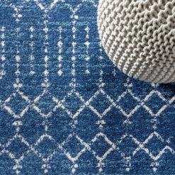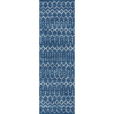 In shades of navy and ivory, this Moroccan trellis is Inspired by timeless vintage designs and crafted with the softest polypropylene available. This beautiful linear pattern is made modern in a deep navy yarn power loomed for durability. The simple geometric stripes, triangle and diamond motifs will give a fresh look to any room.