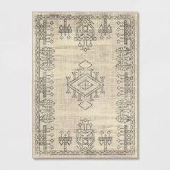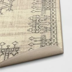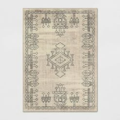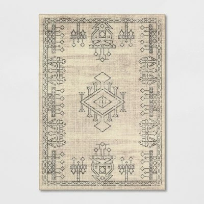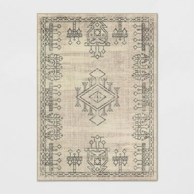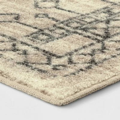 Give any room a dash of vintage charm with the Hancock Distressed Center Motif from Threshold™. Made of a soft material with a latex backing for added convenience, this tufted rug will instantly change the look of any room while providing soft comfort underfoot. This rectangular area rug is designed with a distressed beige surface decorated with a black geometrical motif in the middle and framed by a complementing geometric-pattern border for a chic aesthetic that seamlessly blends in with your existing decor. Easy to clean, this low-pile rug is ideal for use in a variety of areas within your home, including the living room, bedroom, home office or den.