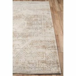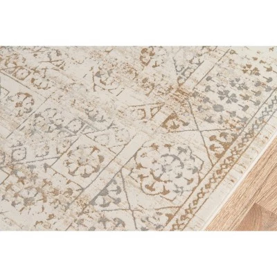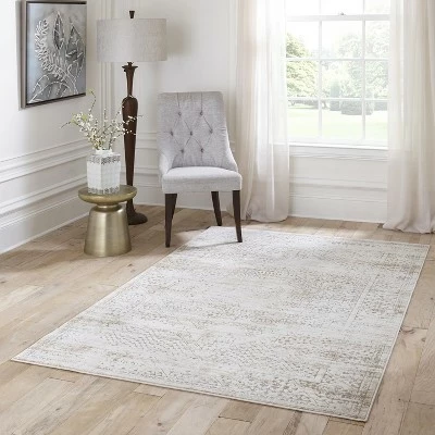 The distressed look of this transitional area rug adds instant beauty and intricate details to interior spaces. A combination of polypropylene and viscose fibers create an assortment of area rugs with a silky soft hand and timeworn textures, as soft synthetic threads reveal traditional patterns with vintage appeal. Power loomed for lasting comfort and durability, the striated colors give each decorative pattern a slightly deconstructed appearance, perfect for eclectic rooms with an appreciation for antique wares.