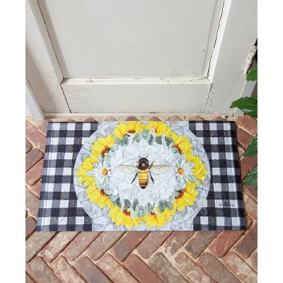 Welcome guests in spring style while sprucing up your entryway with this Honey Bee and Flowers Embossed Floor Mat. This floor mat features a refined bumblebee design in the center of a wreath of vibrant yellow flowers. With checkered borders surrounding a buzzing bee, this design will have a dimensional and whimsical appeal at your doorstep. This embossed mat is made of outdoor safe polypropylene with a recycled rubber backing to prevent slipping. The ridges and grooves of the mat allow it to trap dirt before it enters your house and the thick material absorbs moisture, making it extremely durable and weather resistant. Measuring 30 x 18 inches, this floor mat is the perfect size for your entryway, foyer, or as a home accent. Spot clean as needed or simply shake off loose debris, hose off and hang to dry.