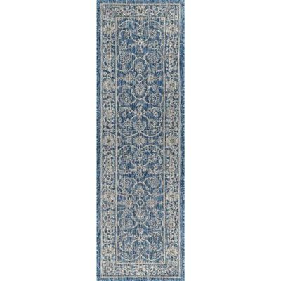 With its twining vines and ornate border, this traditional pattern is an elegant addition to your outdoor porch or patio. Varied tones of blue and navy mingled with a light gray pattern give this rug a rich, hand-woven texture. The flatweave design is great for high-traffic spaces indoors too.