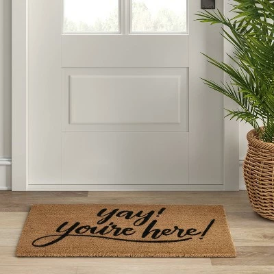You’ll love welcoming your guests with this “Yay! You’re Here” Coir Doormat from Threshold™. Made from all-natural coir fibers, this rectangular tufted doormat helps keep your space clean by scraping away dirt and mud from shoes right at your doorstep, while the PVC backing keeps it from slipping and sliding. Featuring the text “Yay! You’re Here!” in black script set against a tan background, this rectangular doormat looks great anywhere from your entryway to your patio and helps create a warm and friendly vibe.