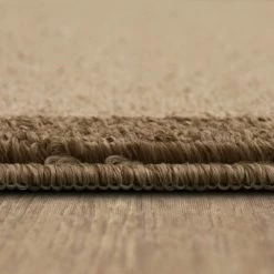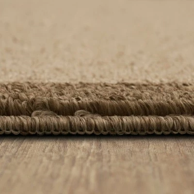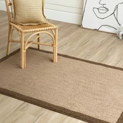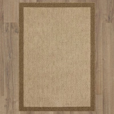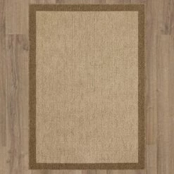 - Solid-color area rug with complementary-colored border blends effortlessly with existing decor