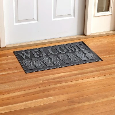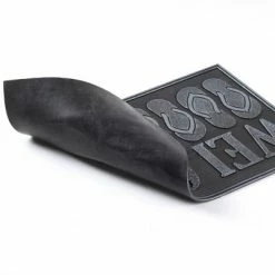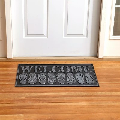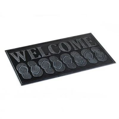 This rubber welcome mat is a pretty and functional addition to your outdoor dΓ©cor. The door mat features a black and silver flip flop design and the word βWelcomeβ across the top of the mat. It is made of weather resistant rubber. It will make a fun statement when placed at your exterior entry way. This welcome mat would make a thoughtful gift for a new homeowner. Rubber. 18β x 30″