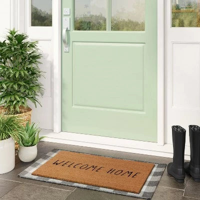 Show warm hospitality to your guests as they reach for the door bell with this Welcome Home Doormat from Threshold™. Designed with backing, this medium-pile doormat is made from 100% coir that gives it a course texture, making it perfect for placing outside your door to scrub off dirt from shoes and preventing it from making its way into your home. In a rectangular silhouette, this decorative doormat features the greeting “Welcome Home” scribbled across a brown background to create an inviting ambiance.