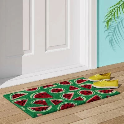 Add a fruity welcome to your front entrance or deck with this 1’6″x2’6″ Watermelon Waiting On Samples Doormat from Sun Squadβ’. This rectangular medium-pile doormat is made with 100% coir that helps keep your home clean by keeping dirt and debris outdoors. Plus, the coir mat has a backing that helps to keep it in place as youβre scraping your shoes clean. Designed for everyday use, this outdoor doormat features a fun, allover pattern of watermelon slices against a green background to usher in guests with a warm welcome.