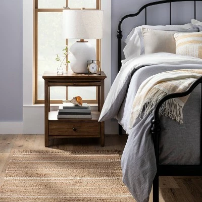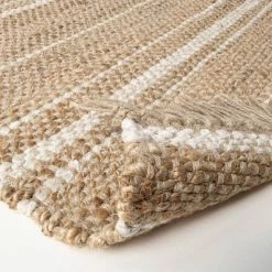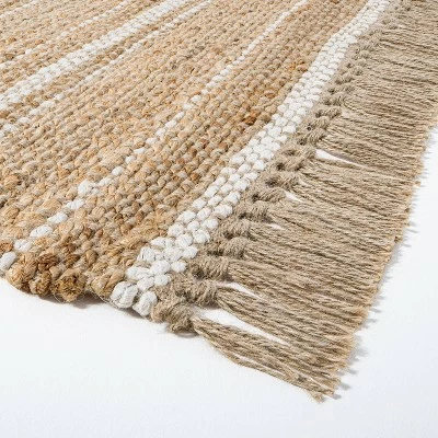 Bring subtle style to your abode with the Jute Variegated Stripe Area Rug from Hearth & Hand™ with Magnolia. Featuring an allover textured design with variegated stripes and tassels on either end, this decorative area rug adds a combination of simple comfort and timeless style to your existing decor. Crafted from natural fibers in a woven design, this hand-loomed rug has a richly textured and earthy look, and its flat-pile height makes it great for your living room, entryway and more.
