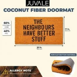 Item DescriptionThe Neighbors Have Better Stuff Nonslip Doormat (17 x 30 In, Natural Coir)PERSONALIZE YOUR HOME: Personalize your entry with this funny natural coir doormat that says “The Neighbors Have Better Stuff”; greet all your guests with this silly rug that is perfect for any homePERFECT FOR: This versatile welcome mat can be placed near the front door, kitchen, laundry room, garden, backyard, or patio; Allergy note: this product contains coir and some people are allergic to coirNATURAL COIR FIBER MAT: Made from natural coir fiber and black PVC backing, this doormat is made to last for a long time and is ideal for both indoor and outdoor useDIMENSIONS: Door mat measures approximately 17 x 30 inchesWHATβS INCLUDED: Includes 1 welcome door mat; non-slip backingPlace a mat in every high traffic area around your home, laundry room, patio doors, back door, porches, and gardens. The natural coir fibers are a sustainable material and effective in grabbing dirt and mud from shoes. The mat surface can withstand extreme temperatures and this resistance will prevent bacteria from piling up on the surface. Please note: this product contains coir and some people are allergic to coir.Product names are trademark of listed manufacturer or other owners, and are not trademarks of eForCity Corp. The manufacturer does not necessarily endorse use of these products.