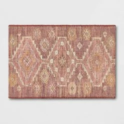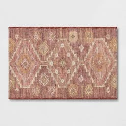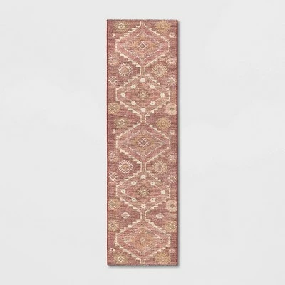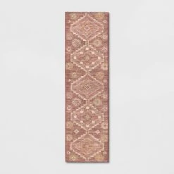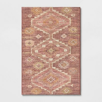 The Southbury Printed Diamond Persian Rug from Threshold™ is a piece of art that covers your floors in vintage style. This rectangular rug provides an effortless way to enhance the look of your empty floors while adding comfort and character to any room. Inspired by traditional Persian design, this woven rug sports faded diamond motifs running the entire length down the center, along with other floral and geometric designs on a muted rust background to give this rug a sophisticated look and feel. Easy to clean, this low-pile rug is ideal for use in a variety of areas within your home, and it has a latex backing to help keep the rug in place.
