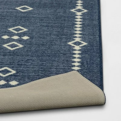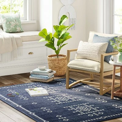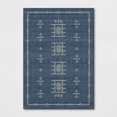 Give a fresh, inviting look to your floors with the Potomac Three-Square Center Motif Rug from Threshold™. Made of a soft material with a latex backing for added convenience, this rectangular tufted rug will dramatically change the look of any room while providing soft comfort underfoot. This rectangular area rug is designed with a textured indigo surface decorated with three squares of geometrical motifs in the middle, surrounded by complementing mini motifs and framed by a white patterned border for a lively aesthetic that effortlessly mixes in with your existing decor. Easy to clean, this low-pile rug is ideal for use in a variety of areas within your home, including the living room, bedroom, home office or den.