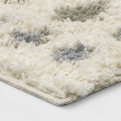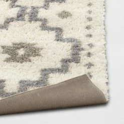 Bring a chic touch of modern appeal to your home with the Bingham Floppy Shag Geo Rug from Threshold™. This shag accent rug is adorned with a geometric pattern made of diamond-like motifs in muted blue and gray shades over a cream background for an eye-catching look. With a latex backing that helps keep the rug in place and a high-pile height that adds a layer of luxurious softness for stepping, this tufted area rug makes a wonderful and versatile addition to your home — use it to elevate the elegance of your interior design and create a cozy atmosphere in your living room, bedroom or home office.