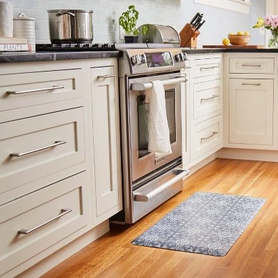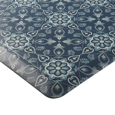 - SIMPLE AND CHIC: The Cat Cora Printed Embossed Gentle Step kitchen mat features a blue mosaic design that will enhance your kitchen dรฉcor.