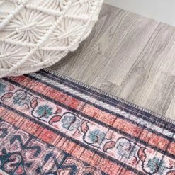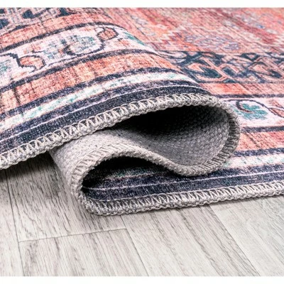 The diamond-shaped medallion in the center of this rug’s design recalls vintage Persian rugs with their vibrant color palettes. A geometric border adds to the vintage charm. This pet friendly rug is forgiving of spills and easy to care for; it’s a versatile classic perfect for a dining room, living room, kitchen, bedroom or porch.