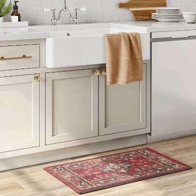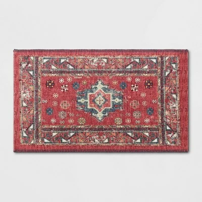 Add old-world artistry to your home with the Vintage Persian Printed Rug from Threshold™. This rug provides an effortless way to enhance the look of your empty floors while adding comfort and character to any room. Inspired by traditional Persian design, this woven rug sports a faded medallion motif at the center with floral accents, framed by a matching border to give this rug a sophisticated design. Easy to clean, this flat-pile rug is ideal for use in a variety of areas within your home, and it has a latex backing to help keep the rug in place.