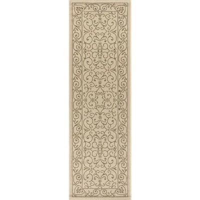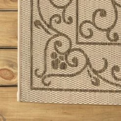With a filigree design reminiscent of antique iron gates, our Boho-chic rug adds eclectic style to an outdoor porch or patio. Varied tones of beige and ivory mingled with a deep brown pattern give this rug a hand-woven, vintage vibe. The flatweave design is great for high-traffic spaces indoors too.
