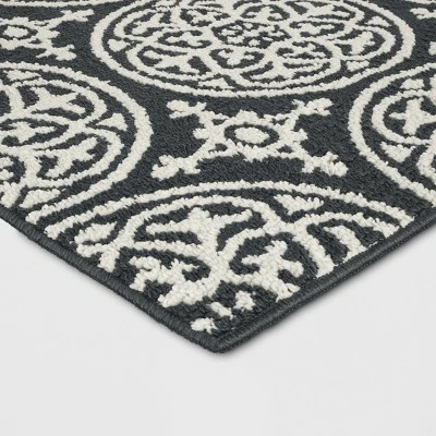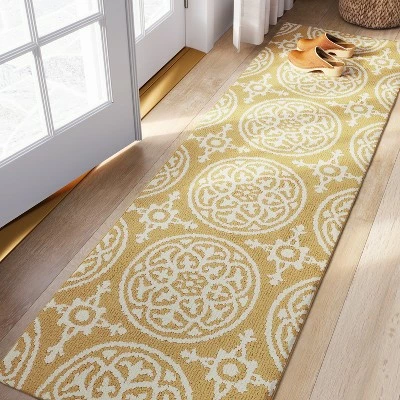 This Washable Tufted And Hooked Rug from Threshold™ is ideal for protecting the flooring in your entryway or hallway from foot traffic. This eye-catching, medallion-patterned rug’s intricate designs will provide a visual focal point for any room, while its tufted, hooked weave adds textural interest. Plus, the latex backing helps keep the rug from sliding around your floors. Constructed with stain-resistant materials to keep it looking new for longer, this machine-washable rug is easy to clean and maintain.