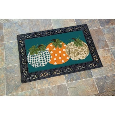 - This doormat will provide an elegant touch on any stoop as it features a trio of uniquely patterned pumpkins.