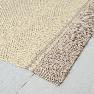 Add textured flair to your abode with this Jute Rug from Hearth & Handβ’ with Magnolia. Featuring an allover textured design with cream stripes and tassels on either end, this decorative runner rug brings a combination of simple comfort and timeless style to your existing decor. Crafted from jute, this woven area rug is durable for lasting use, and the latex/cotton backing helps provide secure footing. A must-have addition to your interior, this jute runner rug features a flat-pile construction, making it highly versatile and easy to place in your living room, hallway, study and more.